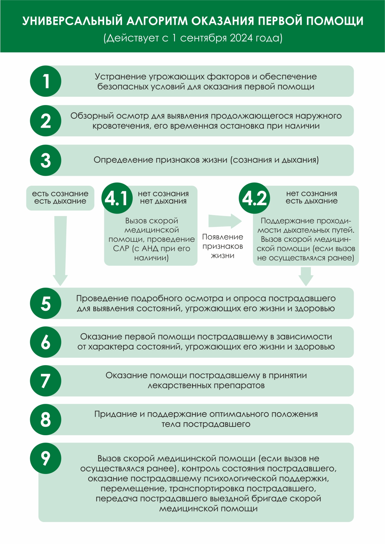 Минздрав России разработал универсальный алгоритм оказания первой помощи, соответствующий актуальным требованиям приказа № 220н. Образец алгоритма на изображении ниже.
